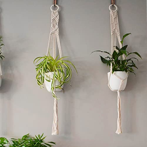 Indulge your plants with affection using this exquisite macrame plant hanger that combines modern flair with vintage-inspired charm. Intricately hand-crafted from durable cotton, a pine shelf, and a metal ring, this plant hanger not only showcases your beloved pots and plants but also doubles as a stylish shelf for books or decorations, adding a touch of geometric and modern boho chic to your home decor. Made from eco-friendly materials, this versatile hanger can be hung from the ceiling or against a wall like a wall hanging, making it perfect for indoor or outdoor use. This item comes with 4 pieces in 3 different sizes (approximate lengths: 46″, 39″, and 35″) to accommodate a variety of flower pot shapes and sizes, ideal for planters up to 7″ in diameter. Please note that props and planters are not included. Elevate your plant game with this lovingly crafted macrame plant hanger. Details; Sturdy; Durable; Modern; Vintage-inspired; Hand-crafted; Cotton; Pine shelf; Eco-friendly; Versatile; Available in Natural color; Package contains 4 items. See product images for product parts, dimensions, and installation methods.